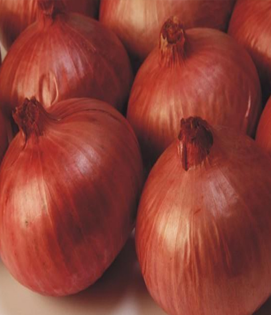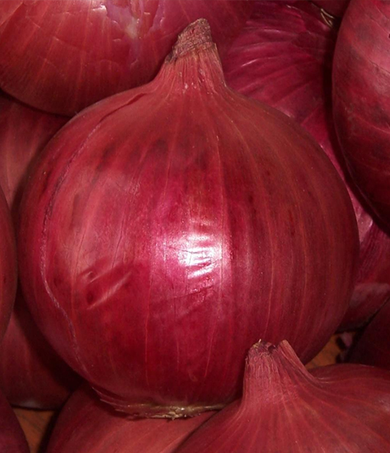 Dark Red, Oblate round in shape, tight skin, bulb wt 90-100 g.