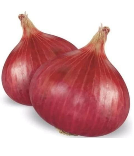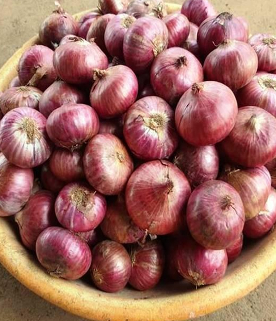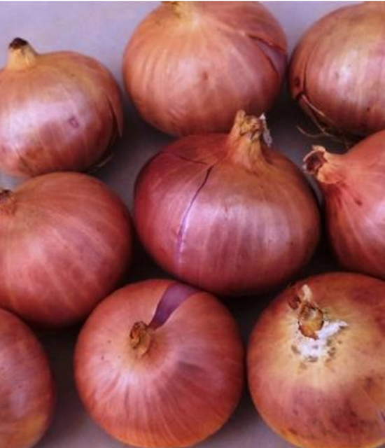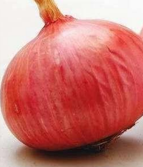 Bulbs are pinkish red, flat round in shape, small to medium size. Weighs about 80-90gm.